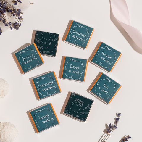 Каждая шоколадка упакована в индивидуальную этикетку с пожеланием.