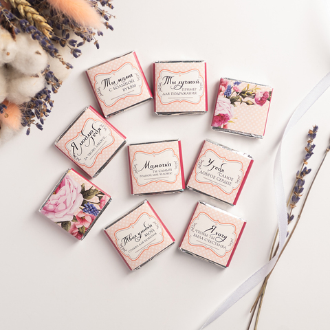 Каждая шоколадка упакована в индивидуальную этикетку с пожеланием.