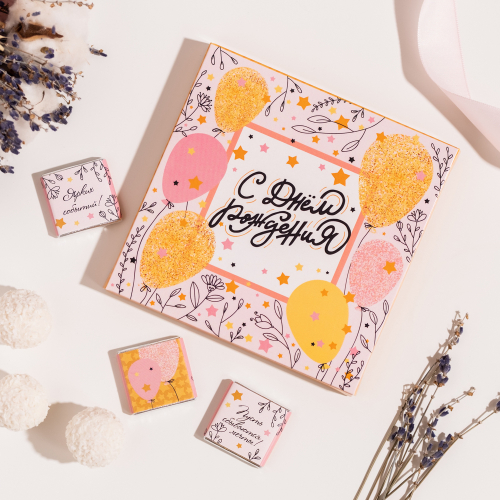 Каждая шоколадка упакована в индивидуальную этикетку с пожеланием.