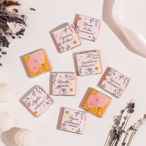 Каждая шоколадка упакована в индивидуальную этикетку с пожеланием.