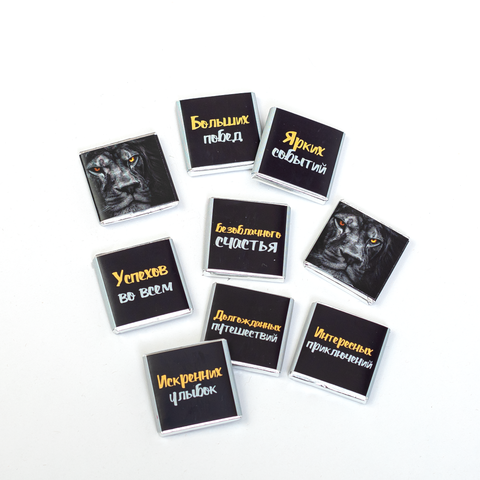 Каждая шоколадка упакована в индивидуальную этикетку с пожеланием.
