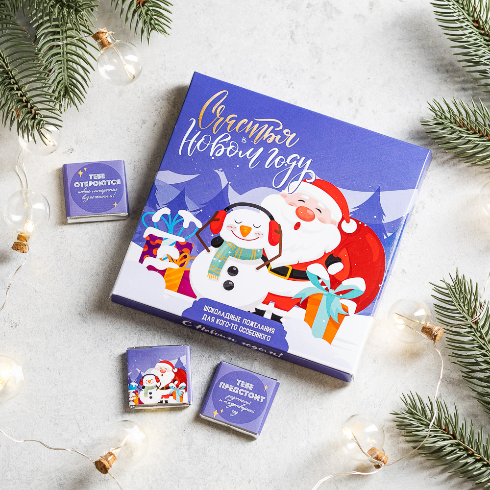 Набор 9 шоколадок "Счастья в Новом году" (дед мороз и снеговик сиреневый)
