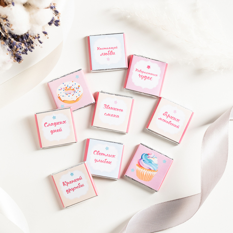 Каждая шоколадка упакована в индивидуальную этикетку с пожеланием.