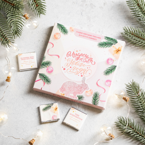 Каждая шоколадка упакована в индивидуальную этикетку с пожеланием.