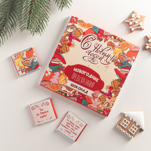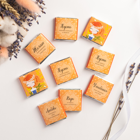Каждая шоколадка упакована в индивидуальную этикетку с пожеланием.