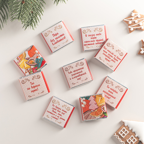 Каждая шоколадка упакована в индивидуальную этикетку с пожеланием.