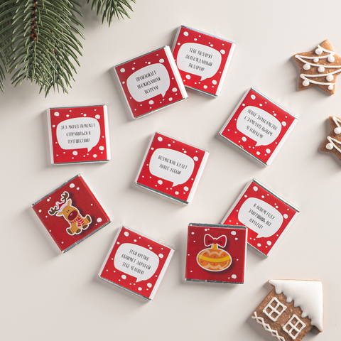 Каждая шоколадка упакована в индивидуальную этикетку с пожеланием.