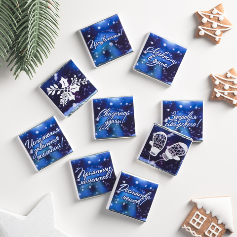 Каждая шоколадка упакована в индивидуальную этикетку с пожеланием.