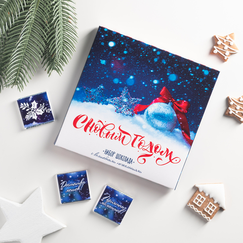 Набор из 9 шоколадок "С Новым Годом. Шарик с красным бантом на синем фоне"