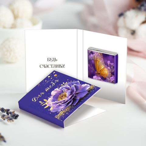 Внутри открытки - 1 шоколадка (вес 5 г., размер: 31 х 31 мм.)