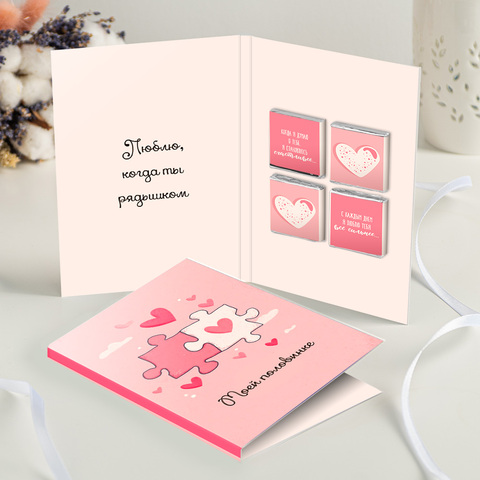 Внутри открытки - 4 шоколадки (вес каждой шоколадки: 5 г., размер: 31 х 31 мм.)