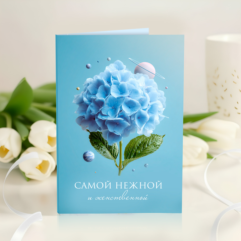 новинка Открытка 4 шоколадки "Самой нежной и женственной (гортензия с планетами)"