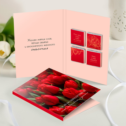 новинка Открытка 4 шоколадки "Самой великолепной (красные тюльпаны)"