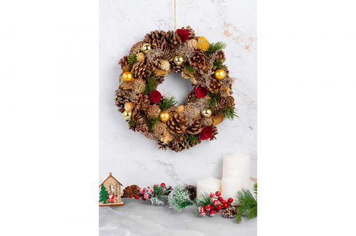 Венок “Санта” станет идеальным украшением на Новый год и Рождество. Размер изделия – 34х34х8 см. Необычное декоративное изделие с настоящими сосновыми шишками и искусственными розовыми бутонами подарит вам праздничное настроение. Поставьте его на полку, стол или подоконник, оперев о стенку или окно. Благодаря прочной петельке его можно повесить на стену, дверь или дверцу шкафа, чтобы привнести в дом уют и сказочность. Прочное основание обеспечит долговечность изделия. Венок найдёт место в любой части вашего дома и украсит интерьер. Используйте его для создания тематических декоративных композиций, чтобы всецело погрузиться в атмосферу зимнего волшебства. Это отличный подарок на Новый год и Рождество для семьи, друзей и коллег. /