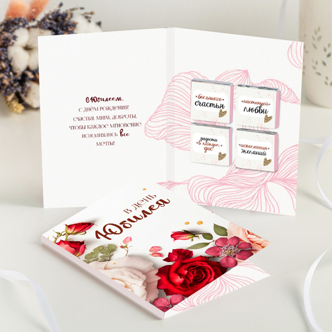 Внутри открытки - 4 шоколадки (вес каждой шоколадки: 5 г., размер: 31 х 31 мм.)
