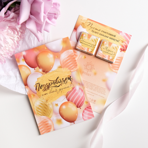 На обороте открытки - 2 шоколадки (вес каждой шоколадки: 5 г., размер: 31 х 31 мм.)
