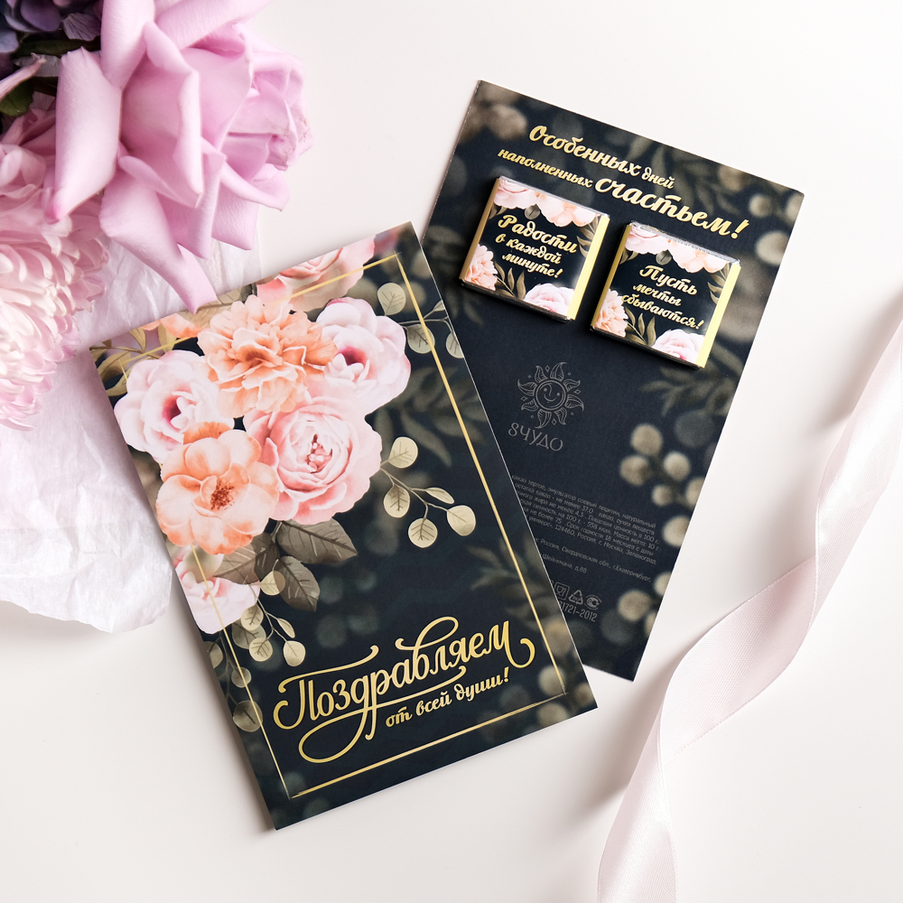 Открытка 2 шоколадки "Поздравляем от всей души (розовые цветы на зеленом)" матовая