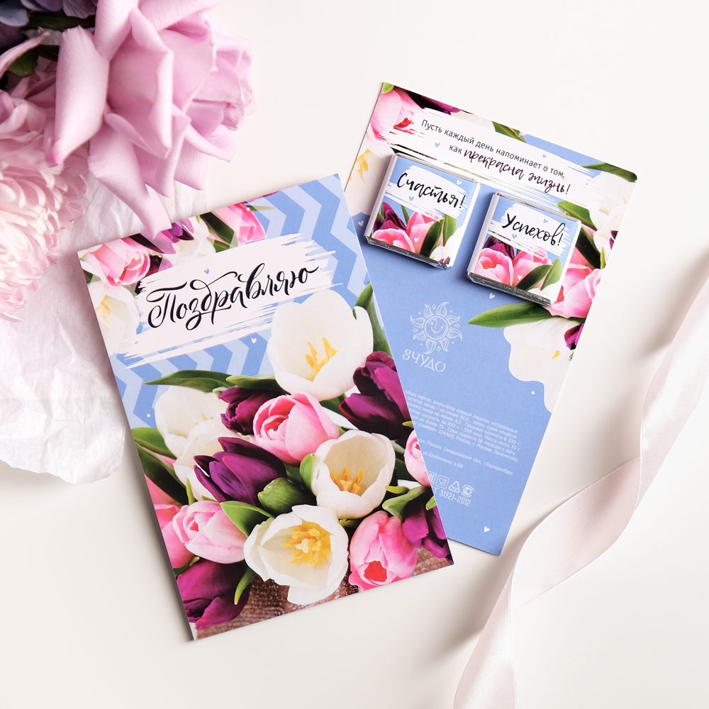 Открытка 2 шоколадки "Поздравляю (тюльпаны)" матовая