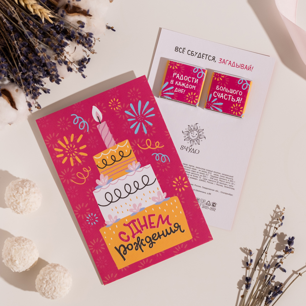 Открытка 2 шоколадки "С днем рождения (торт на розовом фоне)"