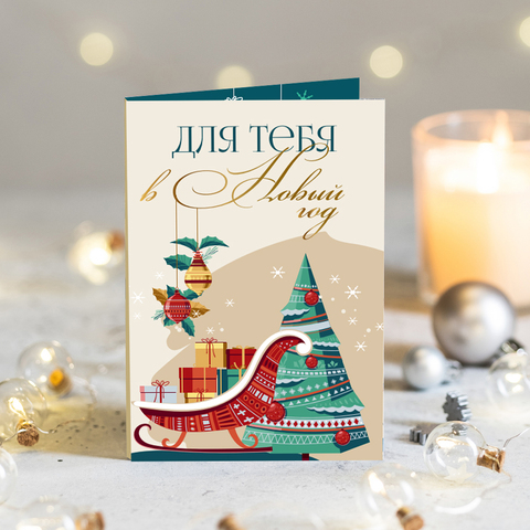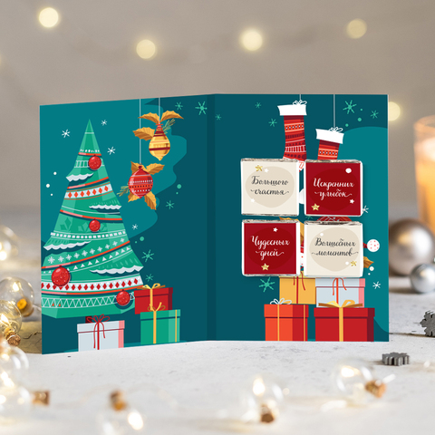 Открытка 4 шоколадки "Для тебя в Новый год" (сани и ёлка)