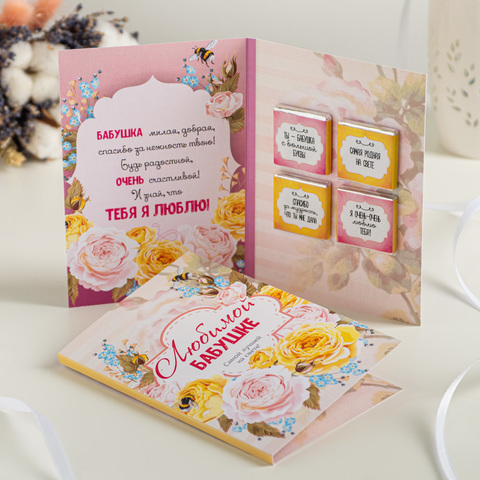 Внутри открытки - 4 шоколадки (вес каждой шоколадки: 5 г., размер: 31 х 31 мм.)