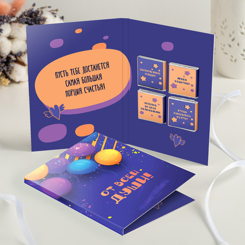 Открытка 4 шоколадки "От всей души" (фиолетовая с шариками)