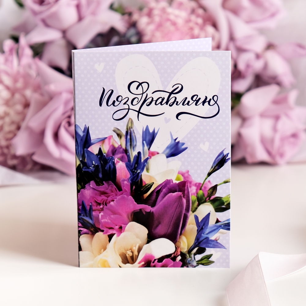 Открытка 4 шоколадки "Поздравляю (Букет цветов на сиреневом)"