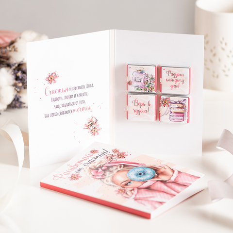 Открытка 4 шоколадки "Расцветай от счастья (девушка с пончиком, розовая)"