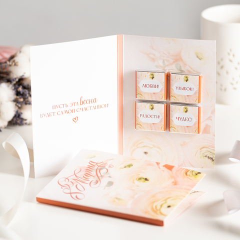 Открытка 4 шоколадки "С 8 марта (светло-розовые цветы)"