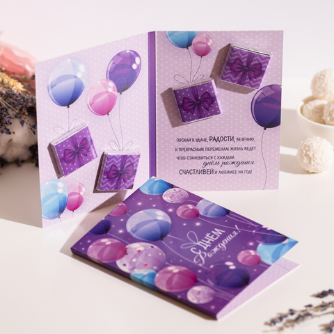 Открытка 4 шоколадки "С днем рождения (воздушные шары, фиолетовая)"