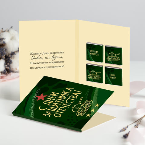 ● Открытка 4 шоколадки "С праздником 23 февраля" (зелёная)