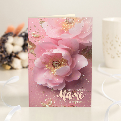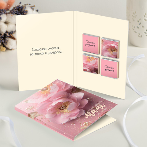 Открытка 4 шоколадки "Самой лучшей маме на свете (розовые цветы с золотым блеском)"