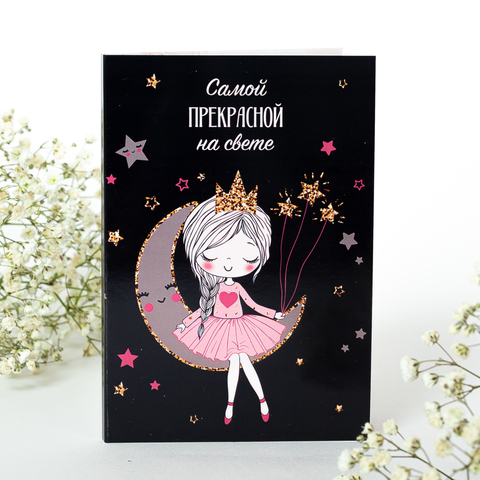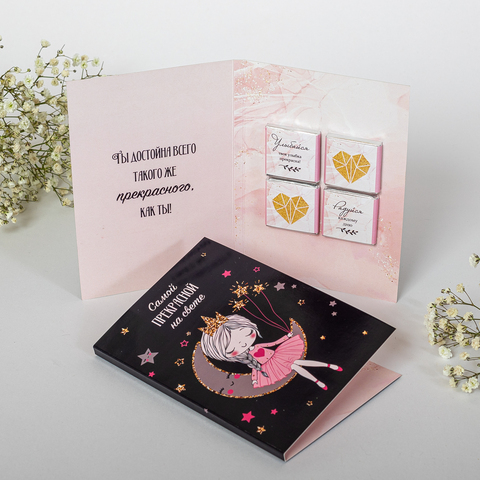 Открытка 4 шоколадки "Самой прекрасной на свете" (девочка со звёздами)
