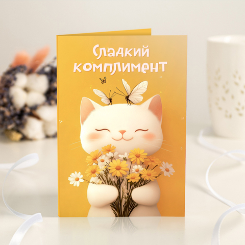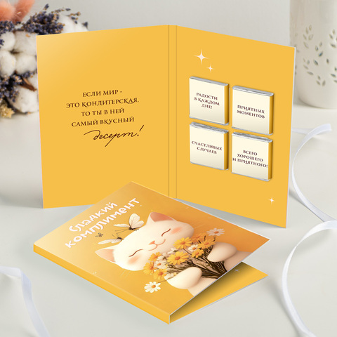 Открытка 4 шоколадки "Сладкий комплимент (котик на жёлтом фоне)"