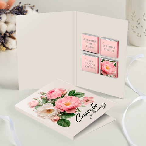 Внутри открытки - 4 шоколадки (вес каждой шоколадки: 5 г., размер: 31 х 31 мм.)