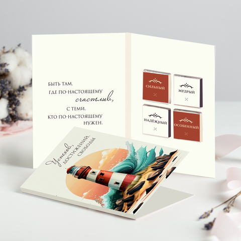 Внутри открытки - 4 шоколадки (вес каждой шоколадки: 5 г., размер: 31 х 31 мм.)