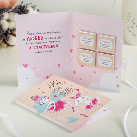 Внутри открытки - 4 шоколадки (вес каждой шоколадки: 5 г., размер: 31 х 31 мм.)