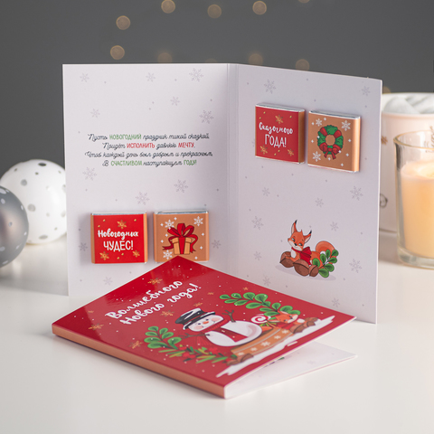 Отзывы и вопросы о товаре «Открытка 4 шоколадки "Волшебного Нового года" (снеговик на красном фоне)»