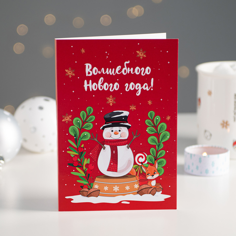 Открытка 4 шоколадки "Волшебного Нового года" (снеговик на красном фоне)