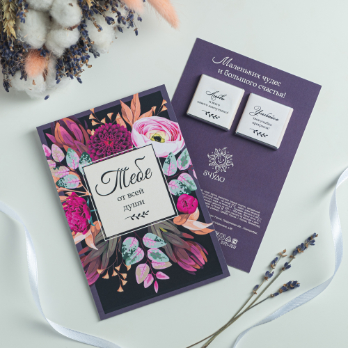На обороте открытки - 2 шоколадки (вес каждой шоколадки: 5 г., размер: 31 х 31 мм.)
