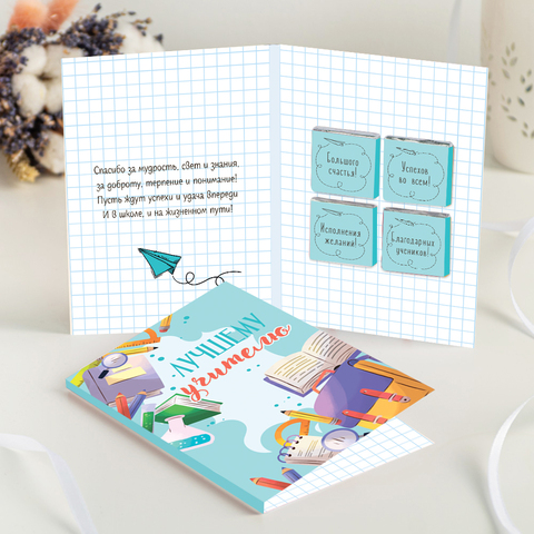 Внутри открытки - 4 шоколадки (вес каждой шоколадки: 5 г., размер: 31 х 31 мм.)