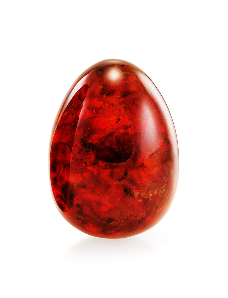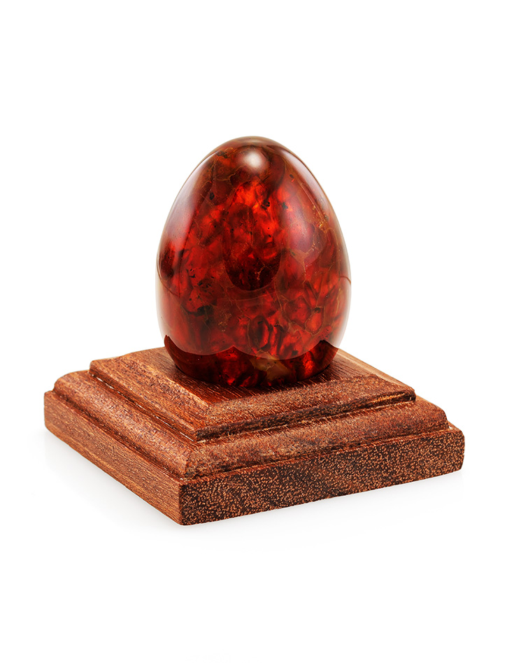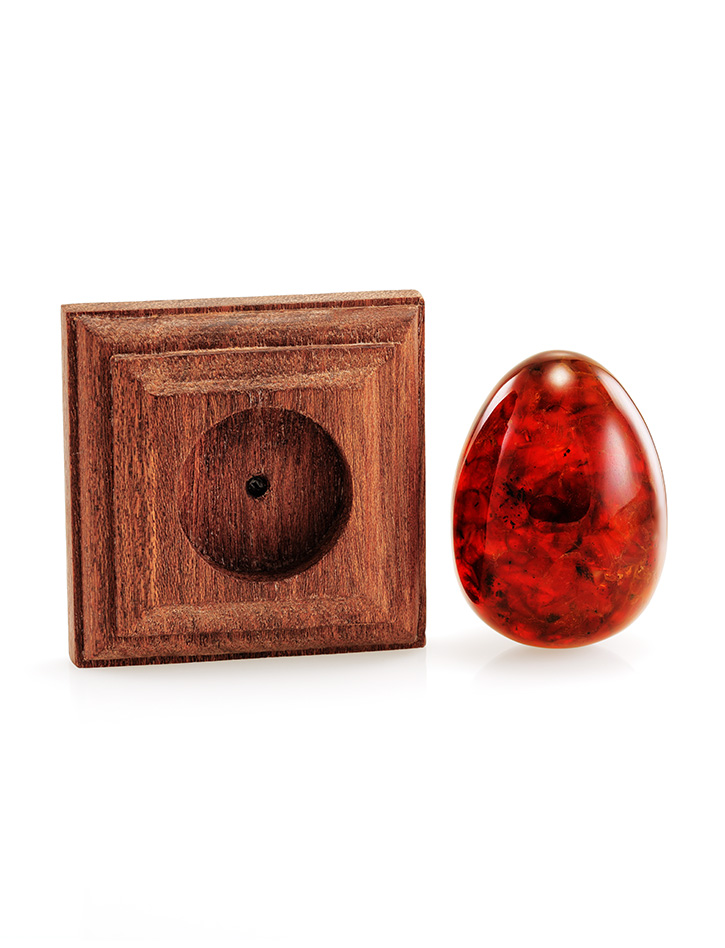 Глянцевое яйцо, созданное из натурального балтийского формованного янтаря красно-коричневого цвета может стать замечательным подарком со смыслом. Небольшая деревянная подставка позволит разместить сувенир в интерьере. Это яйцо можно также использовать в качестве своеобразного массажёра для выполнения кистевых упражнений. При соприкосновении с телом янтарь нагревается, становится очень приятным на ощупь. Он будет делиться с вами положительной солнечной энергией, улучшая не только ваше самочувствие, но и поднимать настроение.