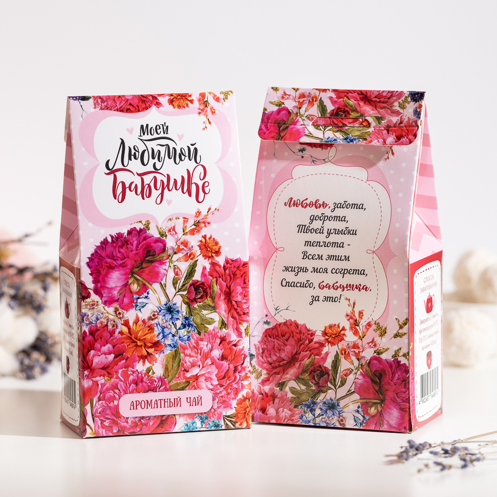 Подарочный чай-домик "Моей любимой бабушке (яркие цветы)", 50г.