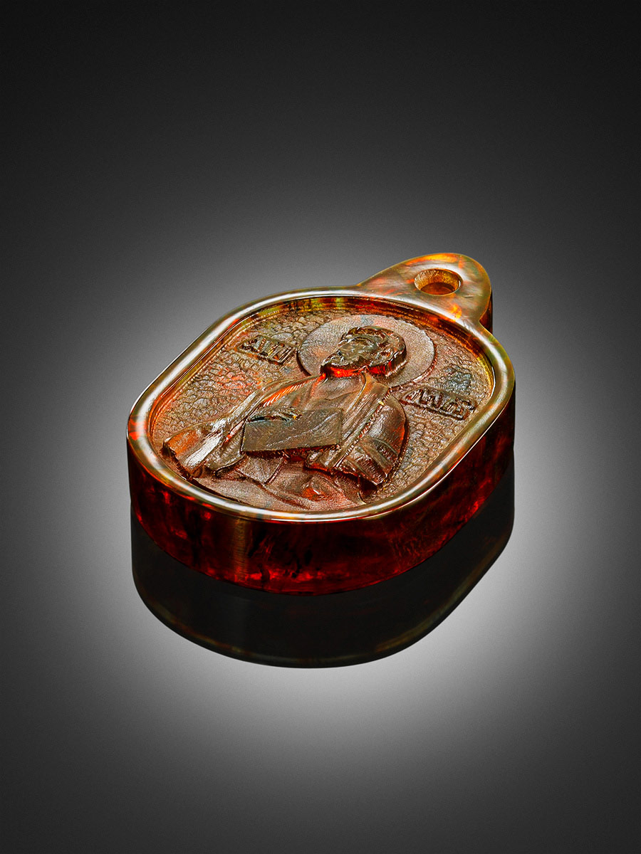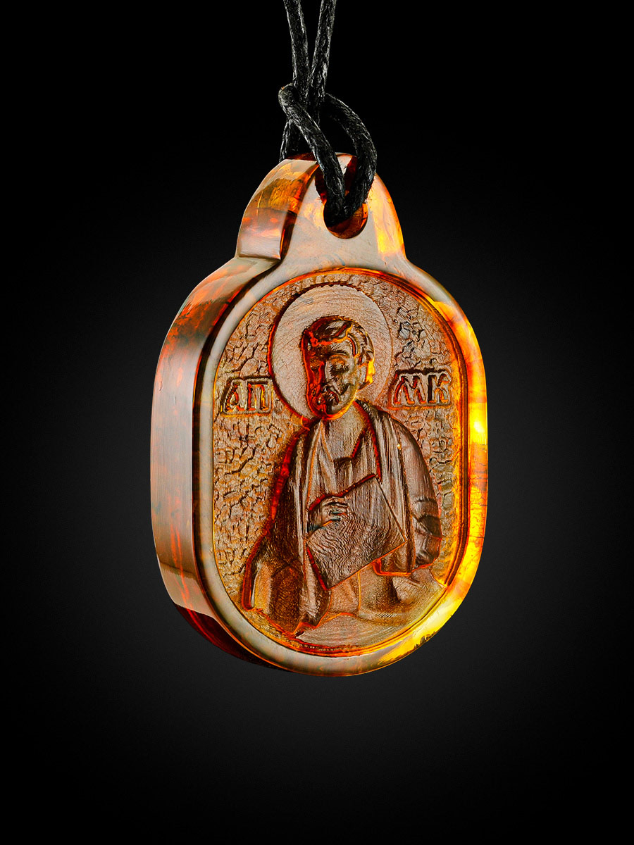 Подвеска-иконка из натурального формованного янтаря с резьбой «Св. апостол Марк Евангелист»