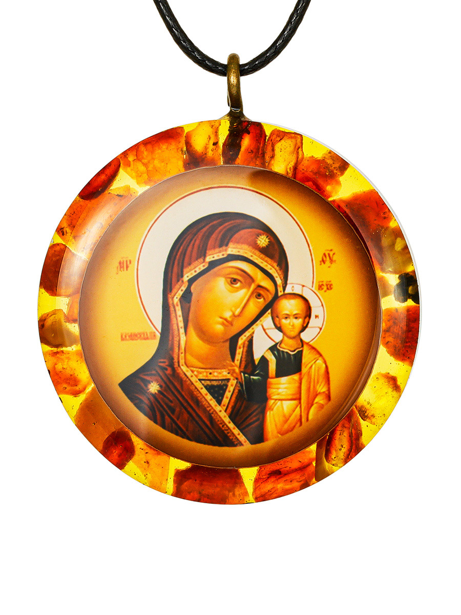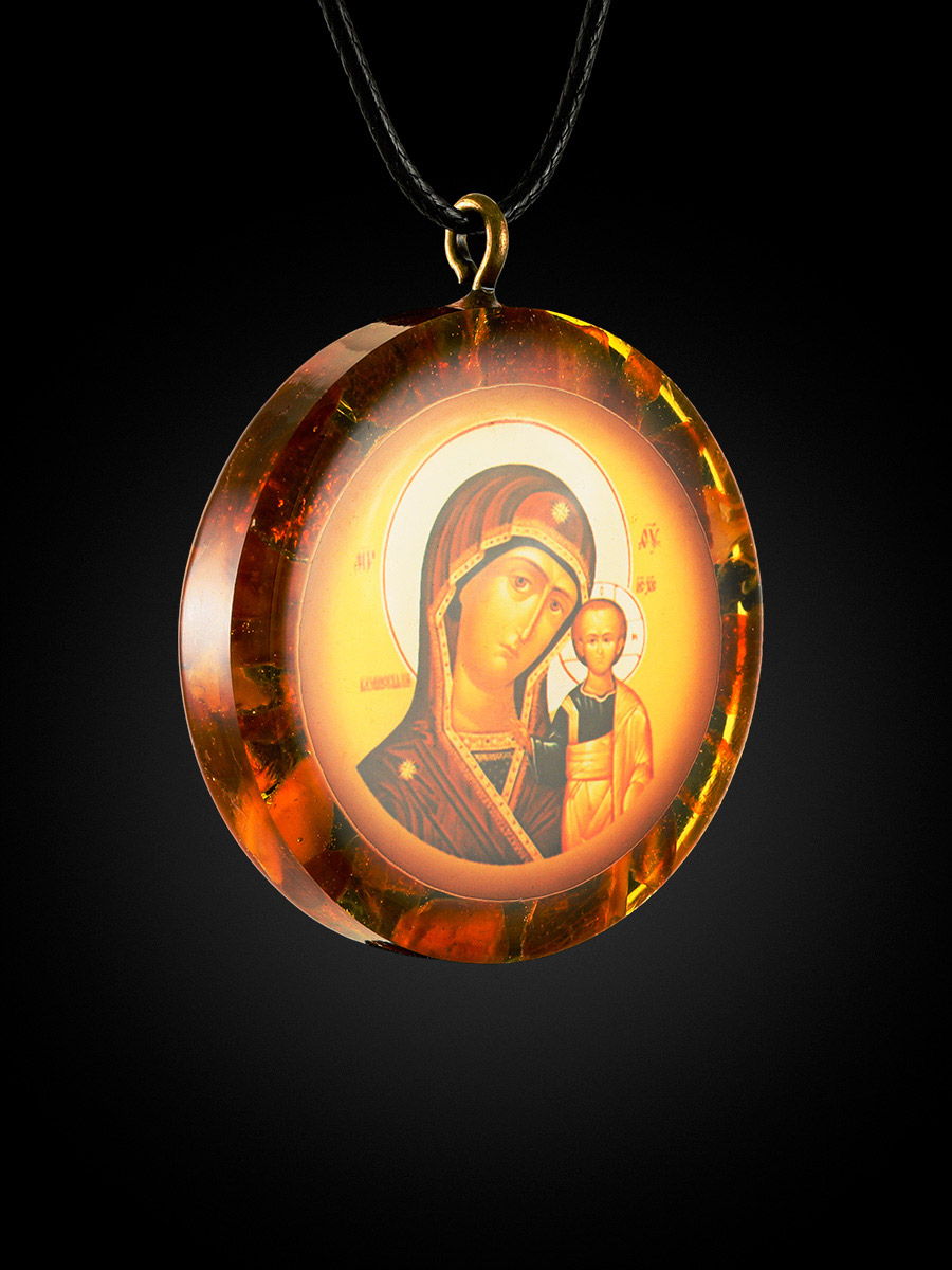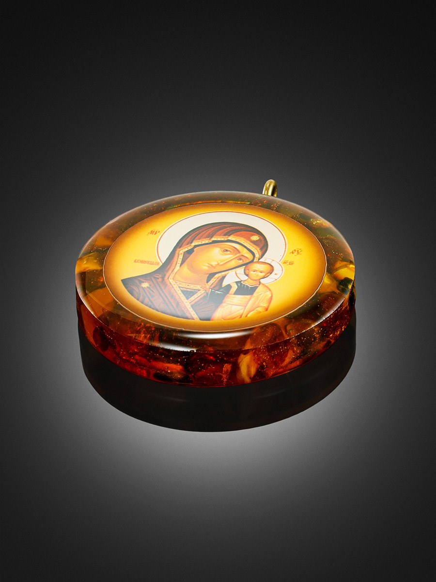 Подвеска-иконка «Казанская Богоматерь» в янтарной оправе