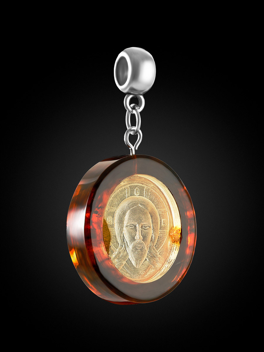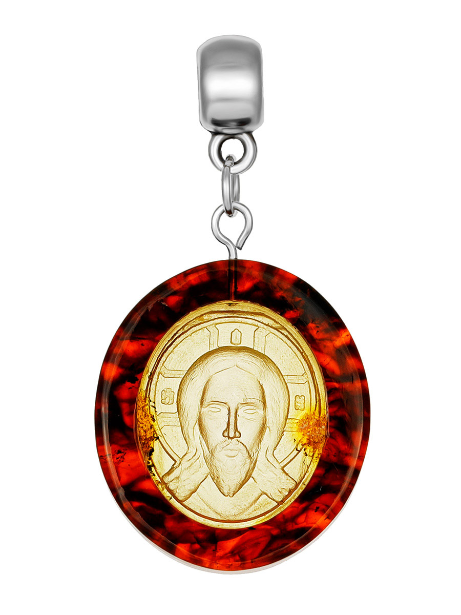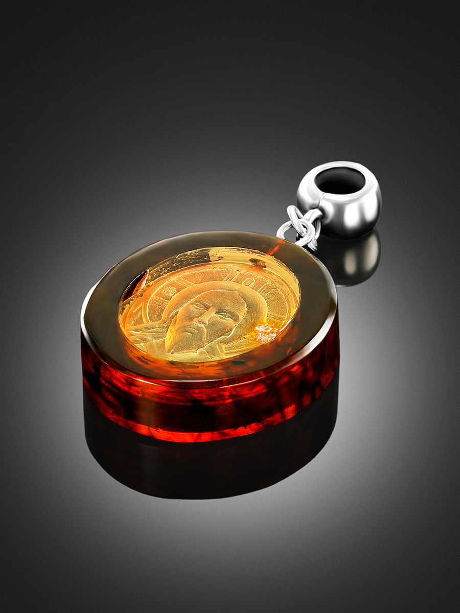 Подвеска из натурального балтийского янтаря с резьбой в контрастном обрамлении «Спас»