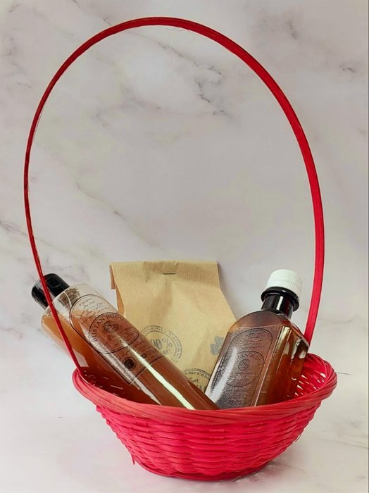 Вы получите корзину, которую видите на фото. Флаконы 250 мл и 200 мл приложены в демонстрационных целях. Вы можете наполнить корзинку самостоятельно, например заказав товары у нас.
