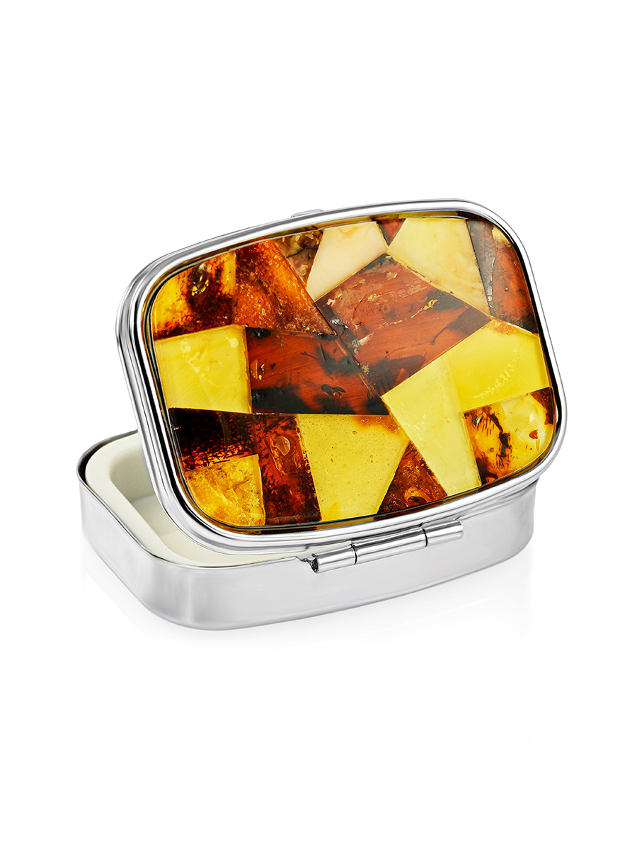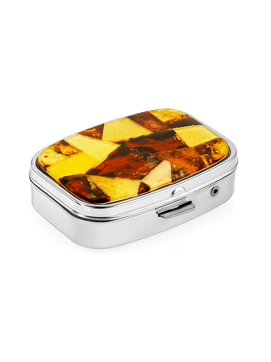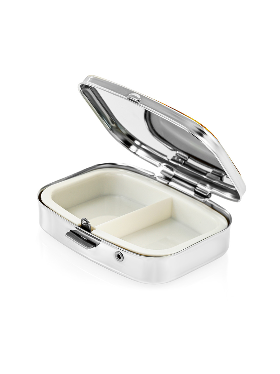 Шкатулка-органайзер для таблеток на два отделения, украшенная янтарной мозаикой