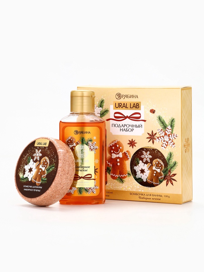 Новогодний подарочный набор косметики: гель для душа 100 мл и бомбочка для ванны 100 г, аромат имбирное печенье, URAL LAB