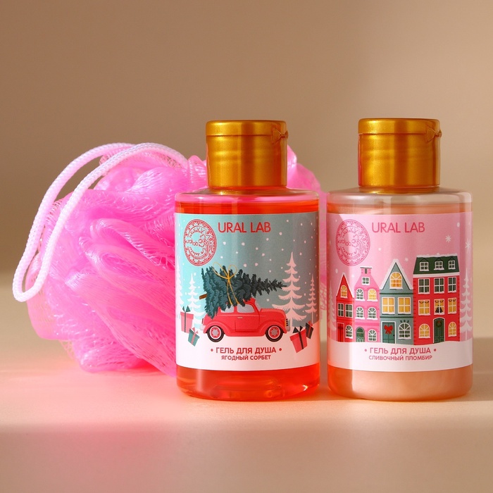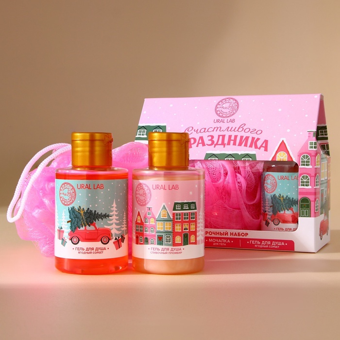 Новогодний подарочный набор косметики «Счастливого праздника», гель для душа 2×100 мл и мочалка для тела, URAL LAB